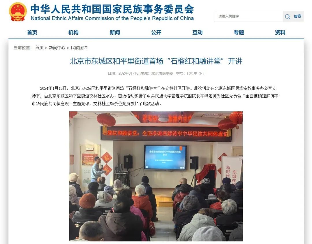 2024年1月16日,365best体育官网登录车峰副经理受邀为社区党员做“全面准确理解铸牢中华民族共同体意识”主题党课,交林社区50余位党员参加了此次党课。本次活动在北京东城区民族宗教事务办公室支持下,由东城区和平里街道交林社区承办,是北京市东城区和平里街道的首场“石榴红和融讲堂”活动,国家民委对本次主题党课作专题报道。